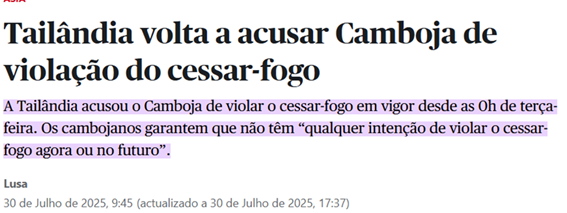 SE13806 - (Siga Escrevente. 2025. Inéditas) Um conflito fronteiriço, em que uma nação acusa a outra de violar um cessar-fogo, tem gerado tensão no sudeste asiático. A nação acusada, por sua vez, nega as alegações e afirma seu compromisso com a trégua.