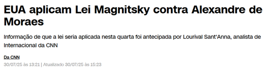 SE13801 - (Siga Escrevente. 2025. Inéditas) O governo dos Estados Unidos aplicou uma sanção a Alexandre de Moraes, ministro do Supremo Tribunal Federal (STF), sob a acusação de censura e violação de direitos humanos. A medida, que foi considerada inaceitável pela Advocacia-Geral da União, representa uma forte pressão diplomática.