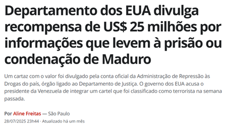 SE13802 - (Siga Escrevente. 2025. Inéditas) O governo dos Estados Unidos anunciou uma recompensa milionária por informações que levem à prisão e/ou condenação do presidente da Venezuela. A medida foi divulgada pelo Departamento da Justiça dos EUA.