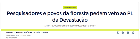 SE13804 - (Siga Escrevente. 2025. Inéditas) Aprovado na Câmara dos Deputados, o Projeto de Lei 2159/21, que facilita o licenciamento ambiental, é duramente criticado por organizações ambientalistas e pesquisadores. A proposta é considerada um dos maiores retrocessos ambientais legislativos desde a ditadura militar.