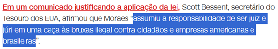 SE13803 - (Siga Escrevente. 2025. Inéditas) Em um comunicado do Departamento de Estado dos Estados Unidos, o secretário do Tesouro dos EUA, Scott Bessent, justificou a aplicação da Lei Magnitsky contra o ministro Alexandre de Moraes com uma forte acusação.