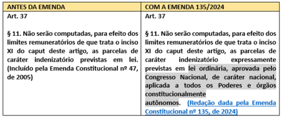 Não serão computadas, para efeito dos limites remuneratórios de que trata o inciso XI do caput do art. 37, as parcelas de caráter indenizatório expressamente previstas em lei complementar, aprovada pelo Congresso Nacional, de caráter nacional, aplicada a todos os Poderes e órgãos constitucionalmente autônomos.