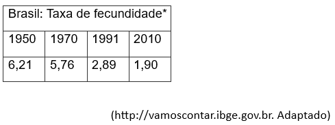 SE12328 - (Vestibular. 2015. Vunesp) Em 1950, cada mulher em idade fértil tinha, em média, 6,4 filhos. Hoje, essa taxa de fecundidade está em 1,7, ou seja, abaixo da taxa de reposição, que é de 2,1. Essa taxa de fecundidade significa dizer que, em 2035, a população do Brasil vai diminuir porque não haverá reposição das perdas.