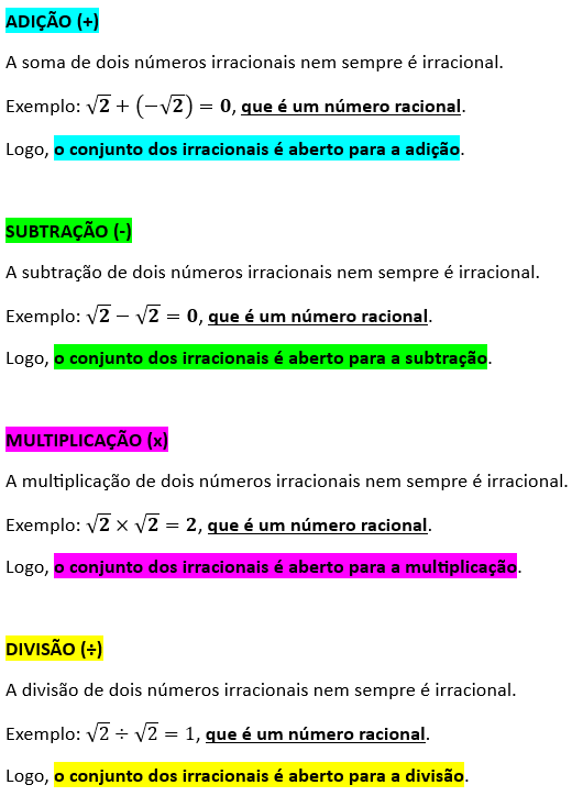 Com relação ao conjunto dos números irracionais (R−Q) e às quatro operações (+, –, ×, ÷), ele é aberto em relação à
