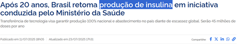 SE13790 - (Siga Escrevente. 2025. Inéditas) O governo federal, em parceria com a indústria, retomou a produção nacional de um medicamento que não era fabricado no Brasil há mais de duas décadas. O primeiro lote foi entregue ao Ministério da Saúde, marcando um passo importante para a autonomia do Sistema Único de Saúde (SUS) na aquisição desse insumo.