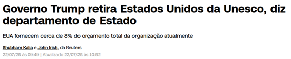 SE13796 - (Siga Escrevente. 2025. Inéditas) O governo dos Estados Unidos decidiu se retirar de uma organização internacional que promove a paz e a cooperação em áreas como educação, ciência e cultura. A decisão, que gerou críticas, é justificada por divergências em relação à agenda da agência e à política externa americana.