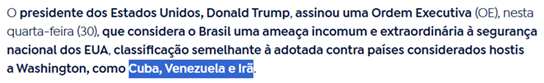 SE13793 - (Siga Escrevente. 2025. Inéditas) A Ordem Executiva assinada pelo presidente Donald Trump, que impõe tarifas ao Brasil, classifica o país de forma incomum e extraordinária à segurança nacional dos EUA. A medida é similar à adotada contra outras nações consideradas hostis a Washington.