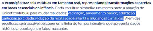 SE13789 - (Siga Escrevente. 2025. Inéditas) Em comemoração aos 75 anos de atuação do Fundo das Nações Unidas para a Infância (Unicef) no Brasil, o Palácio Itamaraty, em Brasília, recebeu uma exposição que homenageia os avanços do país na garantia dos direitos de crianças e adolescentes. A mostra, com seis esculturas, destaca conquistas em diferentes áreas.