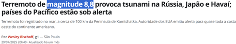 SE13795 - (Siga Escrevente. 2025. Inéditas) Um forte terremoto, que gerou um tsunami, atingiu o leste da Rússia e emitiu alertas para vários países banhados pelo Oceano Pacífico. O fenômeno também foi sentido no Japão e no Havaí.