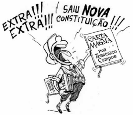 A charge expressa um fato ocorrido no Brasil, na década de 1930. Essa Carta Magna, chamada de “Polaca”, provocou mudanças na estrutura política do país, uma vez que