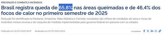 SE13786 - (Siga Escrevente. 2025. Inéditas) De acordo com os dados do Ministério do Meio Ambiente e Mudança do Clima, o Brasil registrou uma redução significativa nas áreas queimadas no primeiro semestre de 2025, em comparação com o mesmo período de 2024. Essa diminuição é atribuída a condições climáticas menos severas e aos esforços do governo federal em parceria com os estados.