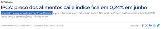 SE13788 - (Siga Escrevente. 2025. Inéditas) O Índice Nacional de Preços ao Consumidor Amplo (IPCA) registrou uma queda em junho, impulsionada por uma variação negativa em um grupo específico. A redução do índice em relação ao mês anterior foi de 0,02%.