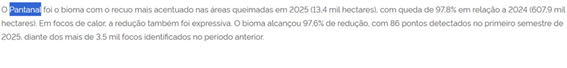SE13787 - (Siga Escrevente. 2025. Inéditas) Um relatório do Ministério do Meio Ambiente e Mudança do Clima revelou uma diminuição significativa das áreas queimadas em diversos biomas do Brasil no primeiro semestre de 2025 em comparação com o mesmo período de 2024. A redução se destaca em alguns biomas.