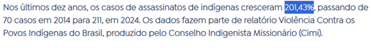 SE13780 - (Siga Escrevente. 2025. Inéditas) O Conselho Indigenista Missionário (Cimi) produziu um relatório que aponta para um aumento significativo dos casos de assassinatos de indígenas no Brasil ao longo da última década, passando de 70 casos em 2014 para 211 em 2024.