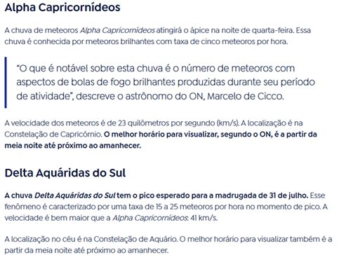 SE13782 - (Siga Escrevente. 2025. Inéditas) O Observatório Nacional (ON) divulgou que duas chuvas de meteoros estarão visíveis no final de julho. Esses fenômenos, que são causados por detritos de cometas, têm características diferentes, como a velocidade dos meteoros e a quantidade por hora.