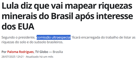 SE13785 - (Siga Escrevente. 2025. Inéditas) O presidente Luiz Inácio Lula da Silva anunciou que solicitou ao seu governo um novo levantamento das riquezas do solo e subsolo brasileiros. Para essa tarefa, uma comissão será criada, com o objetivo de pesquisar o potencial mineral do país, que, segundo ele, foi monitorado em apenas 30% até agora.