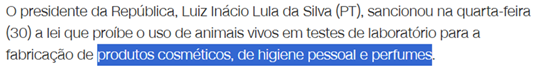 SE13784 - (Siga Escrevente. 2025. Inéditas) O presidente da República, Luiz Inácio Lula da Silva, sancionou uma nova lei que tem como principal objetivo a proteção animal. A medida proíbe o uso de animais em testes de laboratório para a fabricação de determinados produtos no Brasil.