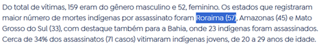 SE13781 - (Siga Escrevente. 2025. Inéditas) O relatório do Conselho Indigenista Missionário (Cimi) sobre a violência contra os povos indígenas no Brasil detalha os estados com o maior número de mortes por assassinato. Os dados indicam uma concentração de vítimas em algumas regiões do país.