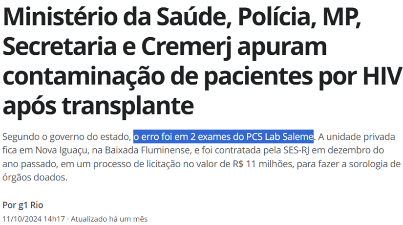 SE12129 - (out/24) Um incidente inédito na história do sistema de transplantes brasileiro ocorreu no Rio de Janeiro, quando órgãos de dois doadores infectados com HIV foram transplantados para seis pacientes que testaram positivo após os procedimentos. Qual foi o erro apontado como a causa do incidente?