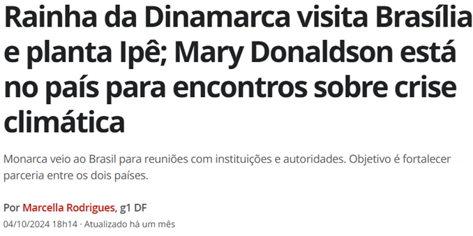SE12126 - (out/24) A visita da Rainha Mary Donaldson, da Dinamarca, ao Brasil em 2024 destacou a cooperação entre os dois países em temas de sustentabilidade e cultura. Durante sua visita, a rainha participou de um ato simbólico ao plantar uma árvore nativa do Cerrado na sede da Embrapa Cerrados.