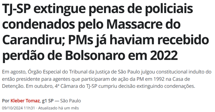 SE12128 - (out/24) Em 2024, o Tribunal de Justiça de São Paulo (TJ-SP) extinguiu as penas de 74 policiais militares condenados pelo Massacre do Carandiru, ocorrido em 1992. A decisão está vinculada a um decreto de indulto natalino concedido anteriormente por qual autoridade?
