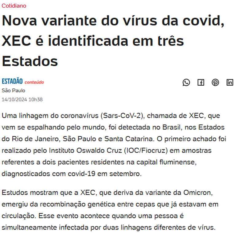 SE12135 - (out/24) Uma nova linhagem do vírus SARS-CoV-2, identificada como XEC, foi detectada no Brasil. A qual variante do vírus essa linhagem pertence, e em quais estados ela foi identificada?