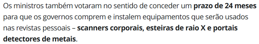 SE12127 - (out/24) Em 2024, o Supremo Tribunal Federal (STF) formou maioria para invalidar a prática da revista íntima vexatória em visitantes de detentos. Além de considerar a prática ofensiva à dignidade humana, o STF também determinou medidas para modernizar o procedimento de inspeção. Qual é o prazo estabelecido pelo tribunal para que os estados adquiram e instalem os equipamentos necessários para substituir as revistas íntimas?