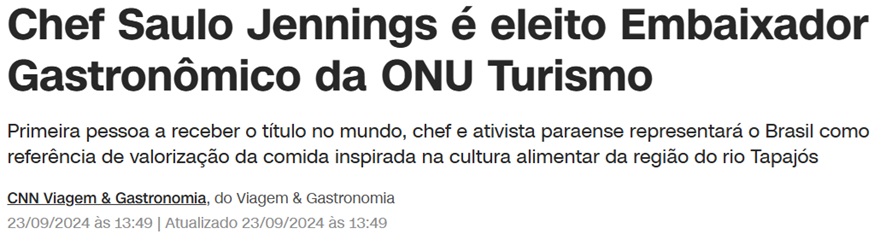 SE12120 - (set/24) O chef brasileiro Saulo Jennings foi escolhido como o primeiro embaixador gastronômico da ONU Turismo. Qual é o principal motivo pelo qual ele foi selecionado para essa posição?