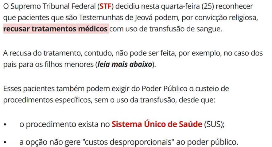 SE12119 - (set/24) Em 25 de setembro de 2024, o Supremo Tribunal Federal (STF) decidiu sobre o direito das Testemunhas de Jeová em recusar tratamentos médicos que envolvem transfusão de sangue. Qual foi a principal determinação do STF relacionada ao tema?