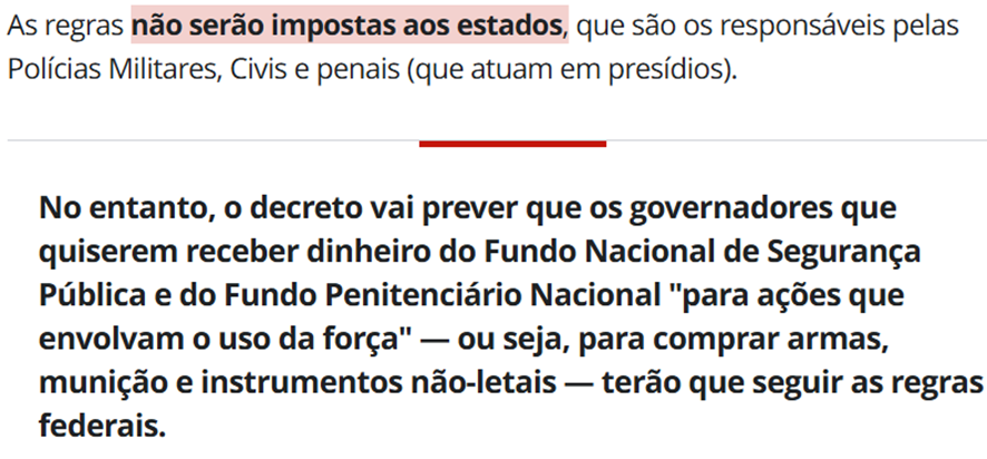 SE12122 - (set/24) O governo do presidente Luiz Inácio Lula da Silva anunciou a preparação de um decreto para regulamentar o uso da força pelas polícias em todo o país. O decreto, que revisa uma portaria de 2010 do Ministério da Justiça e Segurança Pública, tem como objetivo estabelecer diretrizes federais, sem impor obrigatoriedade aos estados. No entanto, para que os estados tenham acesso a recursos do Fundo Nacional de Segurança Pública e do Fundo Penitenciário Nacional, é necessário que cumpram as regras estabelecidas no decreto.