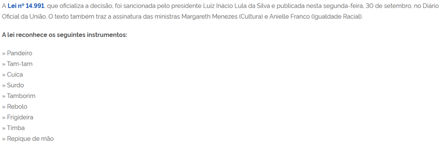 SE12116 - (set/24) A Lei nº 14.991, sancionada em 2024, reconhece nove instrumentos musicais como parte da manifestação cultural do samba. Qual dos seguintes instrumentos não está incluído na lista?