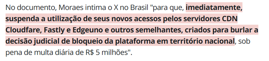 SE12121 - (set/24) O ministro do Supremo Tribunal Federal (STF), Alexandre de Moraes, impôs uma multa de R$ 5 milhões por dia à rede social X (antigo Twitter), após a plataforma driblar o bloqueio judicial que havia sido imposto no Brasil. A rede social teria utilizado novos servidores para permitir o acesso de usuários brasileiros sem a necessidade de VPN, o que descumpriu a ordem judicial. A multa também será aplicada de forma subsidiária à Starlink, outra empresa vinculada a Elon Musk.
