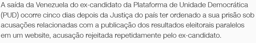 SE12107 - (set/24) O opositor venezuelano Edmundo González deixou o país rumo à Espanha após pedir asilo político. Qual foi o principal motivo alegado para sua fuga?