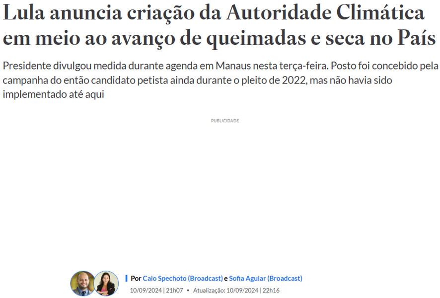 SE12112 - (set/24) Em 2024, o presidente Luiz Inácio Lula da Silva anunciou a criação de uma Autoridade do Clima, com o objetivo de coordenar os esforços do Brasil contra as mudanças climáticas. Qual dos fatores abaixo está relacionado à criação desse órgão?
