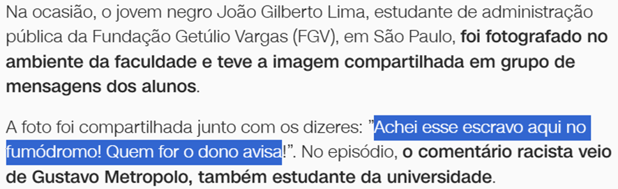 SE12111 - (set/24) Gustavo Metropolo, ex-aluno da FGV, foi condenado por racismo contra João Gilberto Lima, colega negro da universidade o crime foi cometido no ano de 2018. Qual foi o teor da mensagem racista enviada por Metropolo em um grupo de WhatsApp?