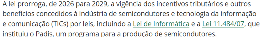 SE12115 - (set/24) O presidente Luiz Inácio Lula da Silva sancionou a Lei n. 14.968/24, que cria o Programa Brasil Semicondutores (Brasil Semicon), com o objetivo de impulsionar a indústria nacional de semicondutores. A lei é importante devido à relevância dos semicondutores na fabricação de componentes eletrônicos, como chips usados em diversos produtos. Entre outras medidas, a lei prorroga a vigência de incentivos tributários e benefícios concedidos à indústria de semicondutores até 2029.