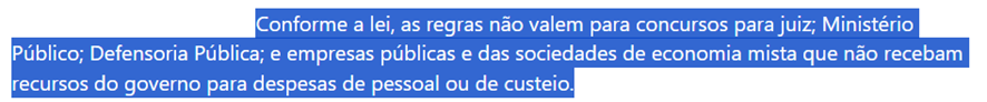 SE12110 - (set/24) A Lei nº 14.965/2024, sancionada pelo presidente Luiz Inácio Lula da Silva, introduziu novas normas gerais para concursos públicos federais. Entre as inovações, a lei permite a realização de provas à distância, desde que seguras e acessíveis para todos os candidatos. Contudo, algumas categorias de concursos não estão sujeitas a essas regras.