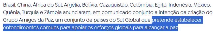 SE12113 - (set/24) Brasil, China e outros 11 países anunciaram a criação do Grupo Amigos da Paz. Qual é o principal objetivo deste grupo?