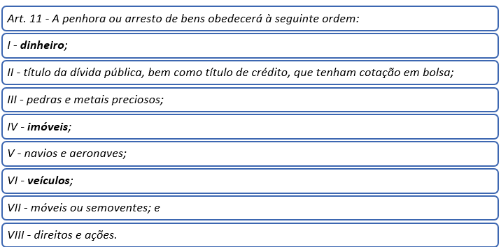 SE12038 - (Procurador. 2024. Outras) Shamas Sin é um próspero empresário com vários negócios no Estado do Mato Grosso, descentralizados em inúmeros municípios. Por força da crise econômica, não recolheu tributos federais devidos, a tempo e a hora, o que acarretou a propositura de execução fiscal com a constrição sobre seus bens. Nos termos da Lei de Execução Fiscal, a penhora ou o arresto de bens obedecerá à seguinte ordem de preferência: