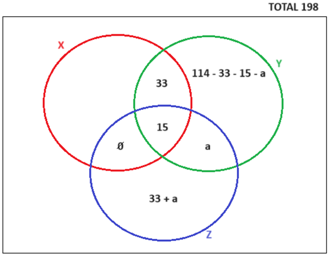 SE12026 - (Técnico Judiciário – TRF/3. 2023. Vunesp) Um clube do livro é formado por 198 pessoas. Semana passada foram sugeridos três livros para leitura, que serão designados por X, Y e Z. Todos os membros do clube leram pelo menos um dos livros, sendo que 15 deles leram os três. Quem leu o livro X também leu o livro Y. O número de membros que leu apenas o livro Z é igual ao total de membros que leram exatamente dois títulos. Sabendo que 48 pessoas leram o livro X e 114 pessoas leram o livro Y, o número de pessoas que leu apenas o livro Y foi