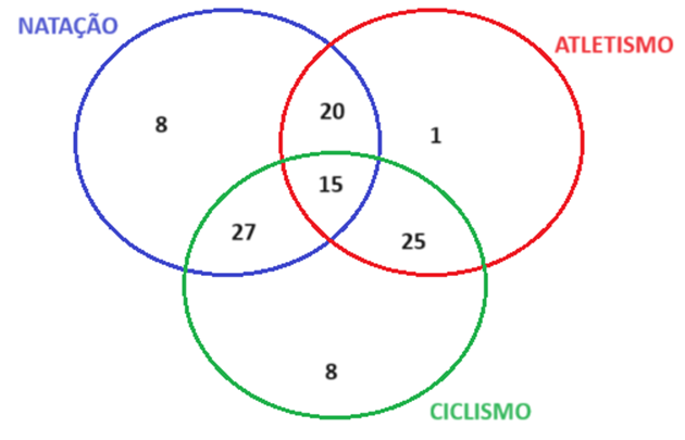 SE12031 - (Oficial de Justiça TJ/SP. 2023. Vunesp) Sobre um grupo de atletas sabe-se que 15 praticam natação, atletismo e ciclismo, 20 praticam somente natação e atletismo, 27 praticam somente natação e ciclismo, e 25 praticam somente atletismo e ciclismo. Se 70 atletas desse grupo praticam natação, 61 praticam atletismo, e 75 praticam ciclismo, então é verdade que, das alternativas a seguir, a que contém a porcentagem que mais se aproxima da relação entre o número de atletas que praticam um único esporte o número total de atletas desse grupo é