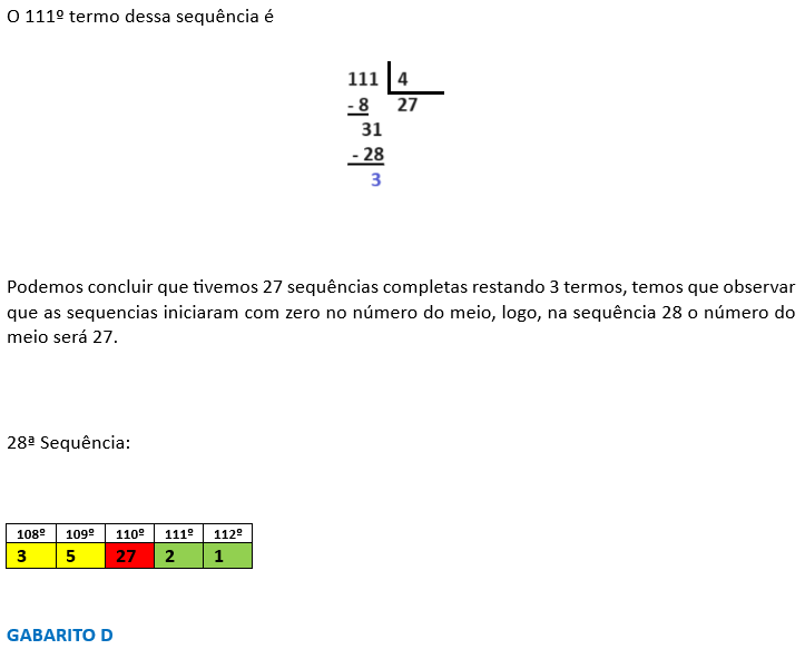 SE12027 - (Técnico Judiciário – TRF/3. 2023. Vunesp) Seja a sequência 21035, 12053, 35021, 53012, 21135, 12153, …, de acordo com o seu padrão de construção, o 40º, 41º e 42º termos são, respectivamente, 53912, 211035 e 121053. O 111º termo dessa sequência é