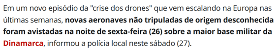 SE13948 - (Siga Escrevente. 2025. Inéditas) No contexto da escalada da "crise dos drones" na Europa, um incidente recente sobre a maior base militar de um país no Mar Báltico levantou novas suspeitas de uma ofensiva coordenada.