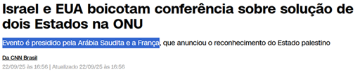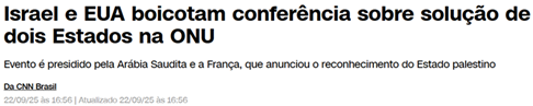 SE13942 - (Siga Escrevente. 2025. Inéditas) A conferência sobre a solução de dois Estados, que visa a coexistência pacífica entre um Estado palestino e o Estado israelense, foi boicotada por nações que discordam publicamente dessa solução. O evento ocorreu na sede da ONU, em Nova York.