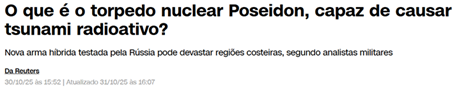 SE13975 - (Siga Escrevente. 2025. Inéditas) O presidente da Rússia, Vladimir Putin, anunciou ter testado com sucesso o supertorpedo nuclear Poseidon, uma arma estratégica híbrida.