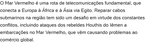 SE13946 - (Siga Escrevente. 2025. Inéditas) O Mar Vermelho é uma rota de telecomunicações crucial, conectando a Europa, a África e a Ásia. A interrupção do tráfego nessa rota, devido a vários cortes em cabos submarinos, gerou um alerta sobre lentidão nos serviços.
