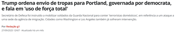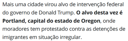 SE13939 - (Siga Escrevente. 2025. Inéditas) Ao ordenar o envio de tropas para Portland, o presidente Donald Trump manifestou-se sobre a forma como as forças federais deveriam agir em caso de necessidade. A instrução do presidente foi considerada de alto risco por especialistas, pois poderia implicar o uso de violência.