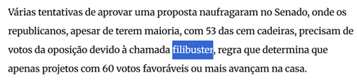 De acordo com a notícia, qual é a regra do Senado dos EUA que exige 60 votos favoráveis para que um projeto de lei avance na Casa, e que tem sido um obstáculo para a aprovação da lei de financiamento do governo?