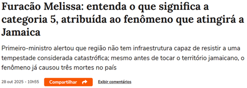SE13970 - (Siga Escrevente. 2025. Inéditas) O furacão de categoria 5, que atingiu a Jamaica e foi o evento mais forte na ilha em 174 anos, tinha ventos máximos sustentados de 280 km/h. O fenômeno causou inundações catastróficas e ameaçadoras.