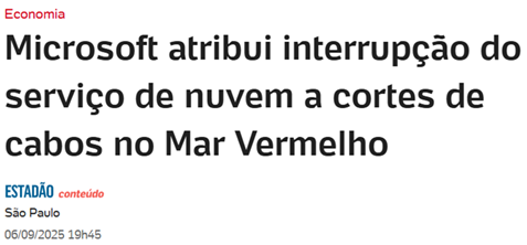 SE13945 - (Siga Escrevente. 2025. Inéditas) A Microsoft alertou que usuários do seu sistema de nuvem Azure podem sofrer lentidão em virtude de vários cortes em cabos submarinos. O Mar Vermelho é uma rota de telecomunicações crucial, conectando Europa à África e à Ásia.
